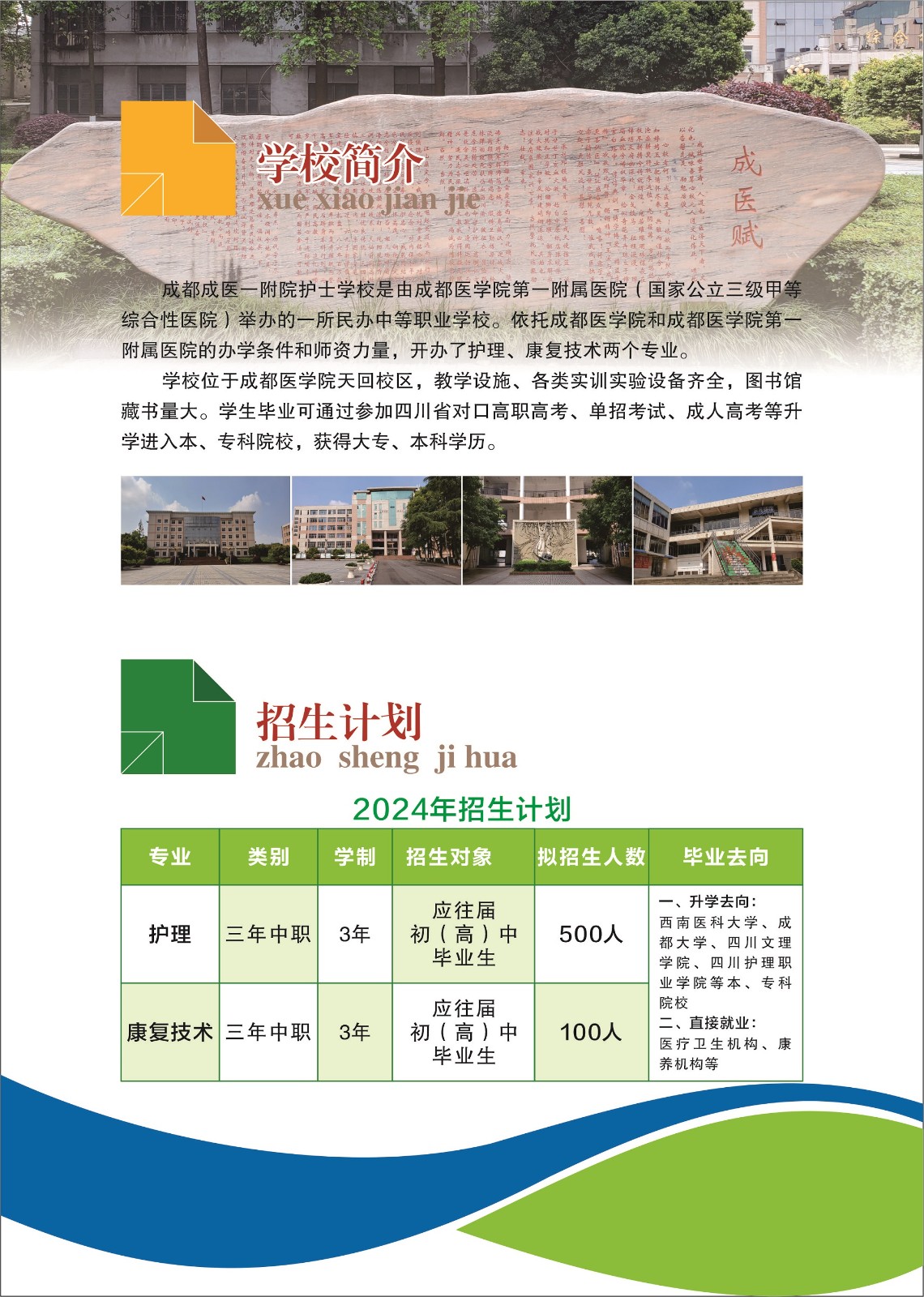 成都成醫(yī)一附院護士學(xué)校是由成都醫(yī)學(xué)院支持、成都醫(yī)學(xué)院第一附屬醫(yī)院舉辦的一所全日制中等衛(wèi)生職業(yè)學(xué)校。全校共3個年級,現(xiàn)有在校生1317人。學(xué)校位于成都醫(yī)學(xué)院天回校區(qū)內(nèi),具有良好的教學(xué)環(huán)境和學(xué)習(xí)環(huán)境。學(xué)校充分發(fā)揮“前院后?!钡霓k學(xué)優(yōu)勢,依托成都醫(yī)學(xué)院和成都醫(yī)學(xué)院第一附屬醫(yī)院良好的師資隊伍和優(yōu)越的辦學(xué)條件,致力于培養(yǎng)適應(yīng)社會需求的實用型護理專業(yè)人才和康復(fù)技術(shù)人才。