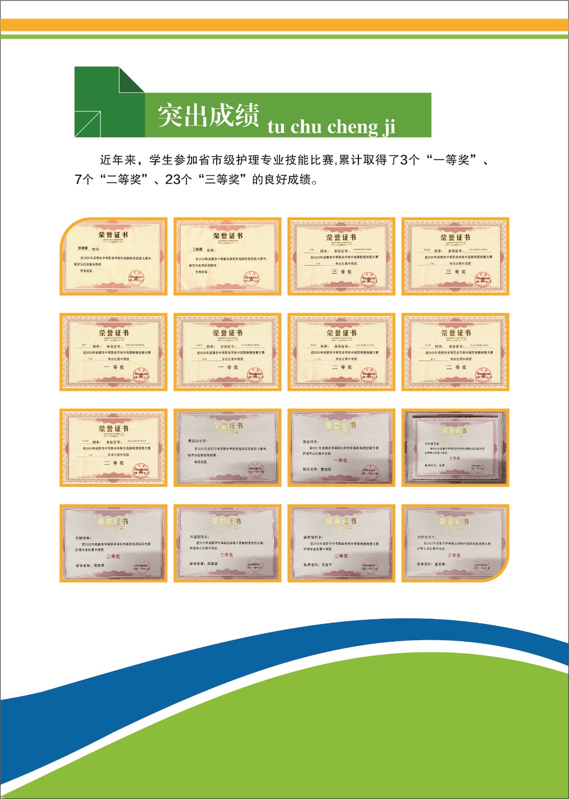 近年來,學(xué)生參加省市級護理專業(yè)技能比賽,累計取得了3個一等獎、7個二等獎、21個三等獎的好成績。